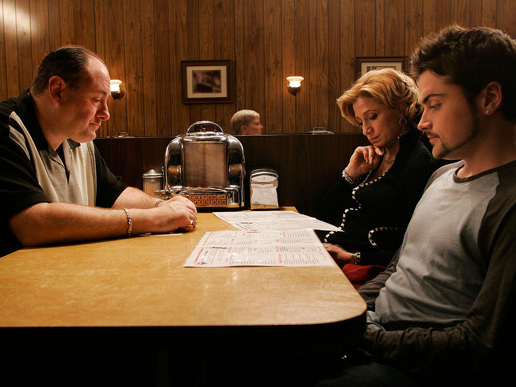 James Gandolfini (left), Edie Falco and Robert Iler, in final scene of The Sopranos